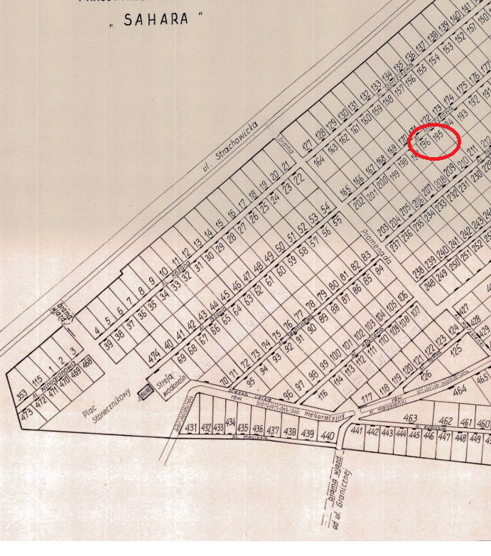 Na działce znajdują się dwie murowane altany w stanie średnim, w środku „graty” po poprzednich działkowcach. Metraż działki – 498 m2. Brak podłączenia prądu, woda – kran ogólnodostępny na alejce.